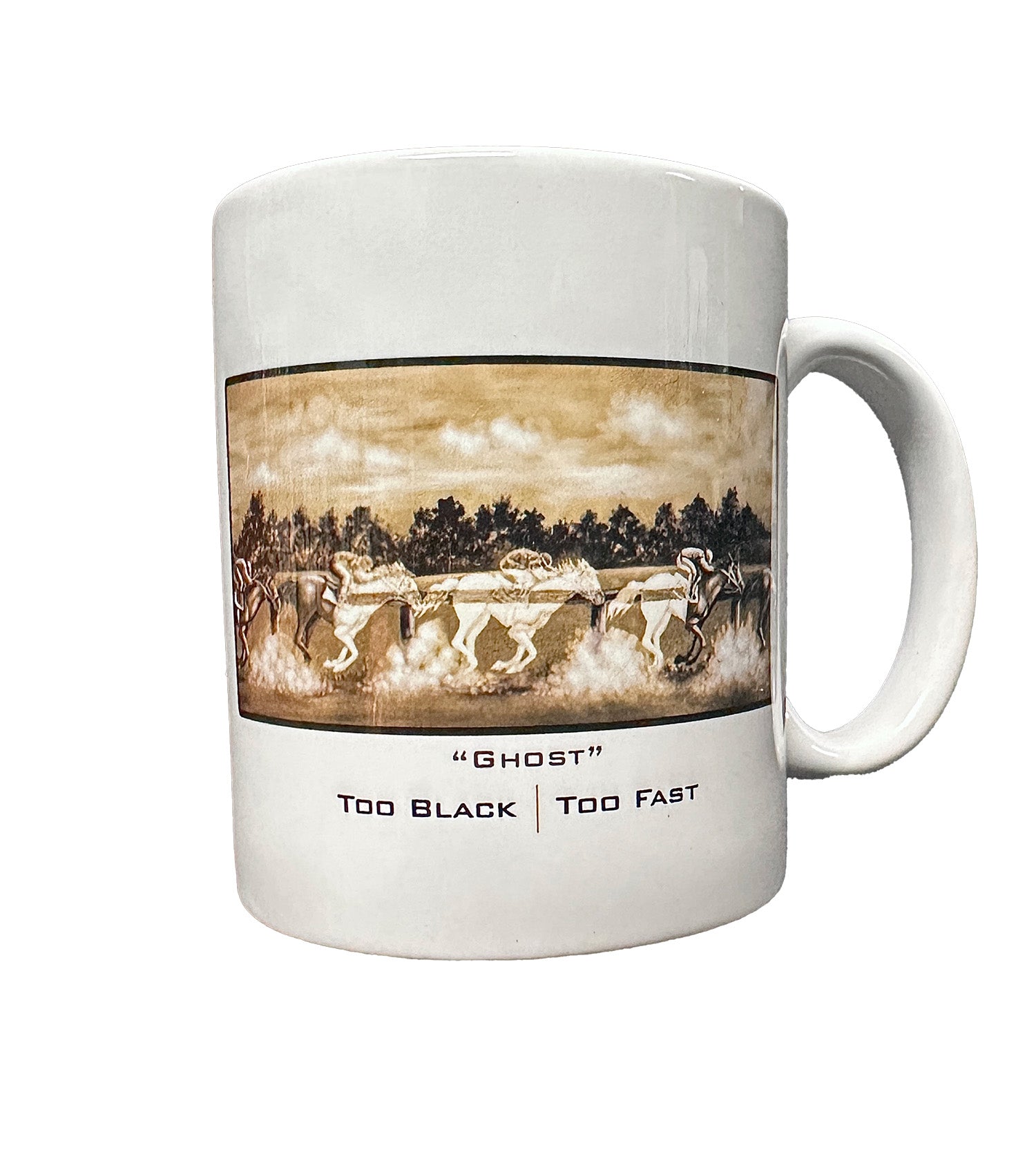 Featuring Michael McBride’s evocative sepia-tone artwork, “Ghost” captures the haunting energy of Black jockeys thundering across history—unseen by many, unstoppable by all. This Too Black Too Fast ceramic mug is a tribute to the legacy that still runs beneath the surface of American sport.